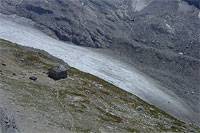 Bild links: Hochfeilerhütte in den Zillertaler Alpen - starker Rückgang der Gletscher.