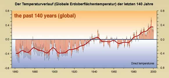 Das obige Diagramm zeigt den Verlauf der Erd-Oberflächentemperatur über einen Zeitraum von 140 Jahren. Die blaue durchgehende Nullinie stellt den errechneten Durchschnittswert der Temperaturen vom Jahre 1961 bis 1990 dar.