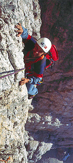 Oben: In der Nordwand der Großen Zinne, "Comici-Führe" (Sextener Dolomiten).