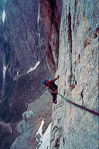 Bild oben: in der Route 'Schwalbenschwanz' einer neueren Route an der Marmolada Südwand, erstbegangen 1978 durch eine Nordtiroler Seilschaft mit Heinz Mariacher. Foto hph. |
