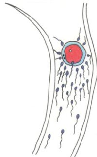 Weg der SamenzelleWährend des Geschlechtsverkehr gelangen die Spermien bei der Ejakulation (Samenerguss) von den Nebenhoden über die Samenleiter, durch die Prostata und die Harn-Samenröhre in die Scheide und von dort über den Uterus in die Eileiter zur riefen Eizelle. Sie wandern mit einer Geschwindigkeit von 3mm/min.. Von den ca.400 Millionen Spermien gelangen nur ca.500 ans Ziel. |