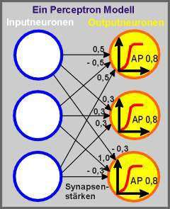 In einem Perception Modell ist jedes Neuron der Inputschicht mit jedem Neuron der Outputschicht verbunden. Jeder einzelne Input wird gewichtet und gelangt so in die Outputschicht. Annahme: Alle drei Outputneuronen haben ein Aktivierungspotential von 0,8.