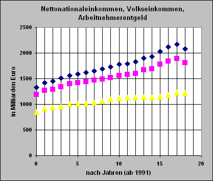 Wir betrachten zunächst die Entwicklungen von Nettonationaleinkommen, Volkseinkommen und Arbeitnehmerentgeld in Deutschland von 1970 an.