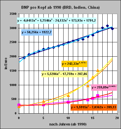 Anmerkung: Natürlich könnte der Schnittpunkt von Funktionen berechnet werden. Und dann gesagt werden, dass genau im Jahr xxxx China dasselbe BNP besitzt wie Deutschland. Aber das ist eine unsinnige (weil nicht deutbare) Rechnung. Wir führen sie nicht durch. |
