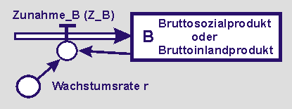 Die Zustandsgröße ist das BIP (B), die Flussgröße die Zunahme_B (Z_B) und der Parameter ist die Wachstumsrate r. In diesem Fall haben wir es also nur mit einem Zufluss zu tun. |